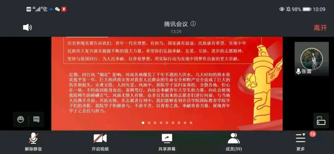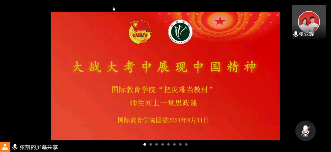 为进一步增强共抗汛情和战胜疫情的必胜信念,引导广大师生增强“四个意识”、坚定“四个自信”、做到“两个维护”。8月11日上午10点,我院召开了“把灾难当教材 我与祖国共成长”师生同上一堂思政课线上会议。这堂空中思政大课围绕“大战大考面前展现中国精神”为题,深入挖掘我院师生在防汛救灾和疫情防控中冲锋在前、迎难而上的先进事迹和感人故事,通过用身边人讲身边事、让身边事激励身边人的形式,引导广大团员青年厚植爱国主义情怀、凝聚青春力量,勇担社会责任。