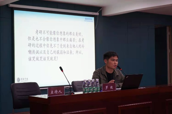本次会议既是考研交流会,又是考研动员会。罗毅老师先后从“要不要考研”、“考研难不难”、“如何备考”、“心得体会”四个方面切入,为同学们具体分析了当前的考研形势和考研的重要意义。