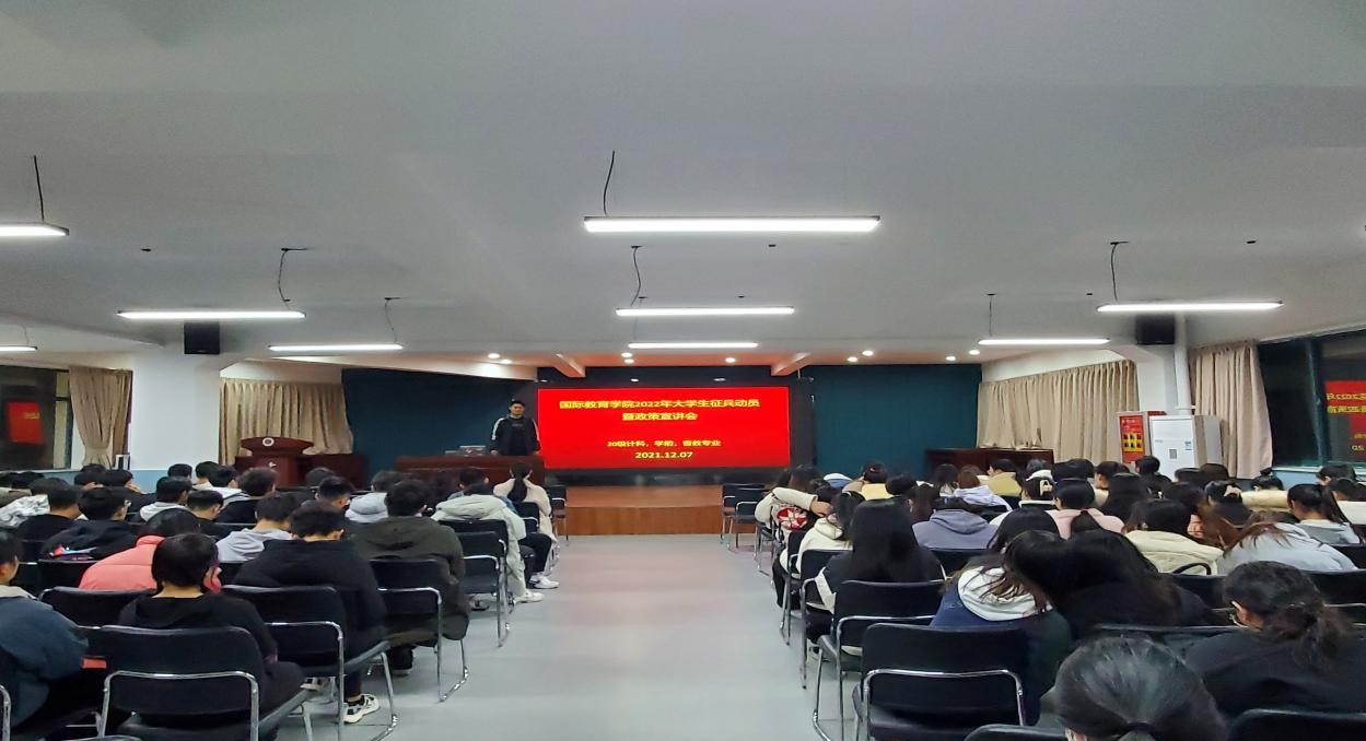 为进一步提升大学生征兵入伍的热情,促进我院2022年大学生征兵工作再上新台阶,2021年12月1日——12月9日,我院团委副书记、征兵专干和全体辅导员老师分别为全体本专科生,举行了国际教育学院2022年大学生征兵动员暨政策宣讲会,覆盖学生3000余人。