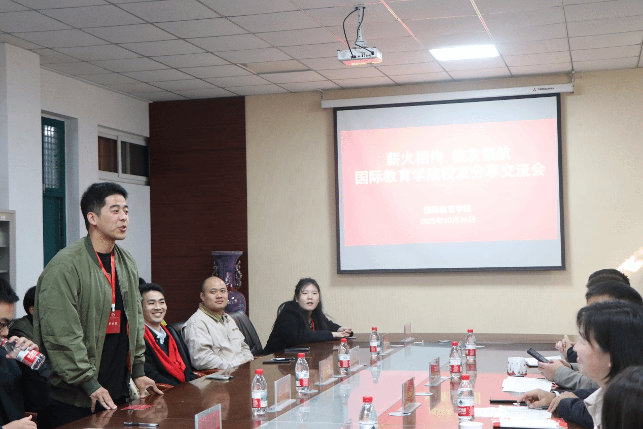 2025年10月26日下午,许昌学院国际教育学院“薪火相传,校友领航”校友分享交流会在学院B4楼121会议室成功举办,会议由院党委书记钱明智主持,学院党委副书记王慧婉、副院长杨枝茂、团委副书记骆映心、科技创新教研室副主任展东红老师参加会议。李文彦、沈少东、葛李杨、乔志浩、张帅鹏、李泽、郝峰、田尚永、李聪聪、黄琳芮、王霈等2011级至今多位优秀校友重返母校,与在校学子畅谈成长经历,共话未来发展。