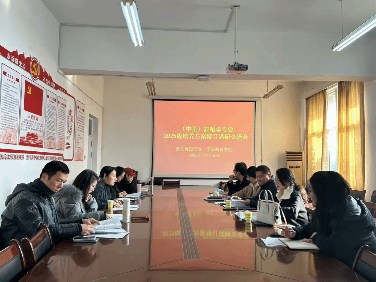 为进一步优化中美舞蹈学专业人才培养方案,深化两院协同育人机制,推动课程体系与国际接轨、与行业需求适配,12月26日,国际教育学院副院长杨枝茂带领艺术教研室相关教师赴音乐舞蹈学院开展人才培养方案专项调研交流会。音乐舞蹈学院副院长李卫玲、舞蹈学专业负责人李乐及骨干教师参加会议。