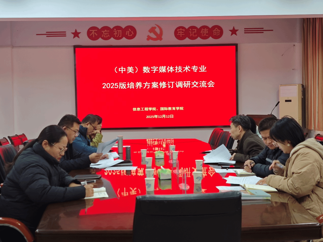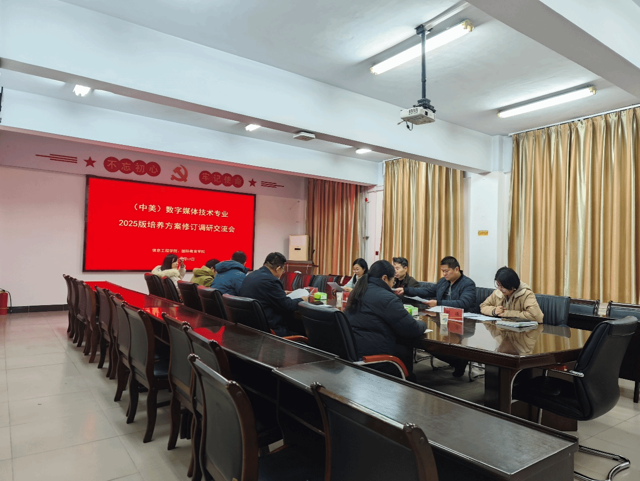 2025年12月12日上午,我院副院长杨枝茂带队到信息工程学院交流研讨2025级中美数字媒体技术专业培养方案修订工作,信息工程学院副院长田胜利、数字媒体技术专业负责人路凯等参加培养方案修订研讨会。