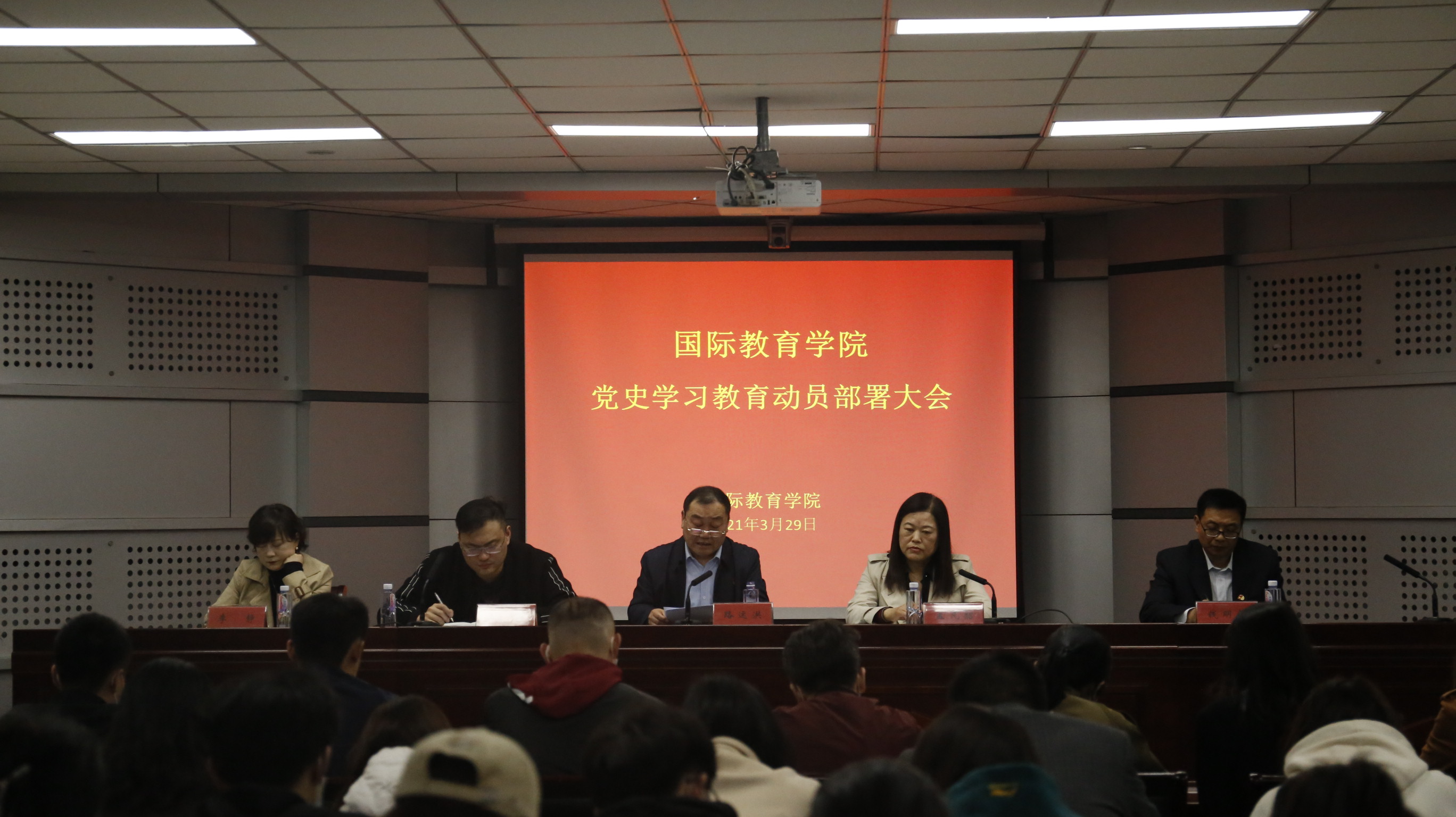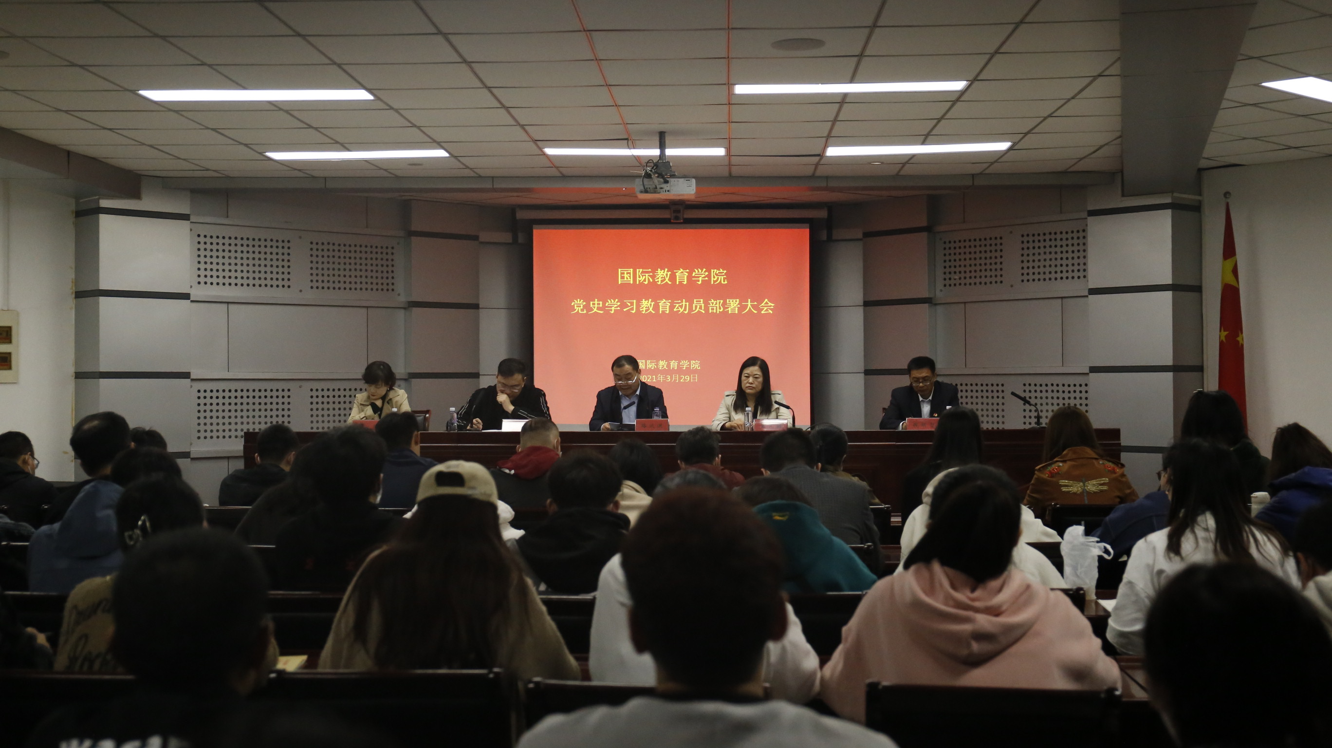 3月29日晚,国际教育学院在校行政楼第三会议室召开党史学习教育动员大会。党委书记路运洪发表动员讲话,党委副书记李想宣读《国际教育学院党委2021年党史学习教育实施方案》,全体党员师生和教师入党积极分子参加会议,会议由院长孟凡韶主持。